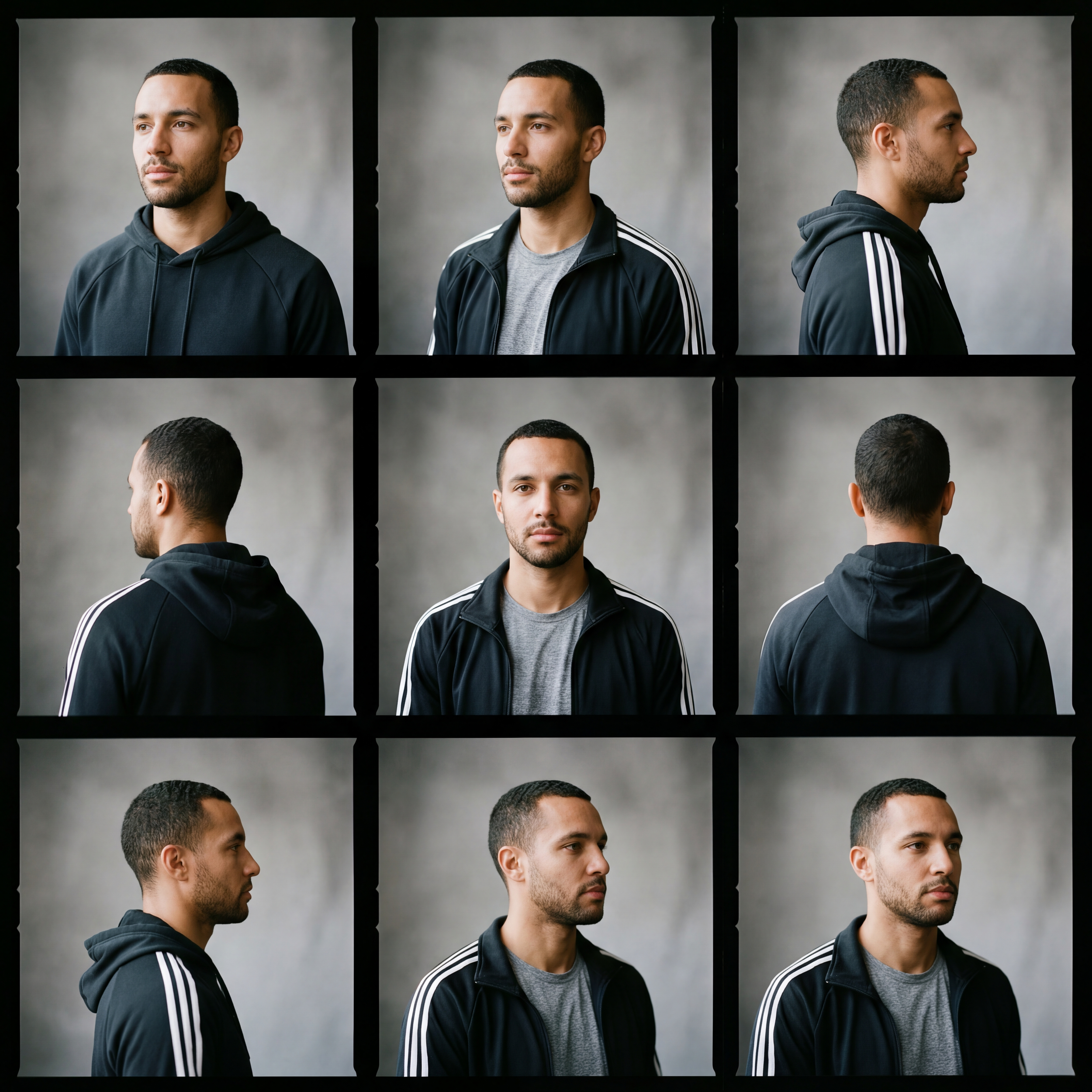 Make sure to include a clear mix of close-ups (face), medium shots (upper body), and full body shots. Photograph the person from the front, at roughly a 45-degree angle, from the side, and also a few from behind. It does not need to be perfectly complete, as long as there is good overall variation, with extra emphasis on close-ups and full body shots.